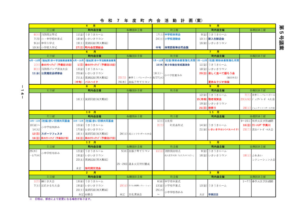 行事・イベント情報 別府一町内会では、年間を通じてさまざまな行事やイベントを実施しています。地域の皆さまがふれあい、交流を深める機会として、幅広い世代が参加できる内容を企画しています。 月間イベントカレンダーを見る 春のバスハイク 消費生活出前講座 楽しく食べて語ろう会 敬老祝賀会 秋祭り クリーンUP宇美川 世代間交流会 まちづくり出前講座(志免町長出前トーク) 応急手当講習会 各種スポーツ大会 春・秋の町内一斉清掃 介護予防教室うきうきルーム ふれあい・いきいきサロンなど